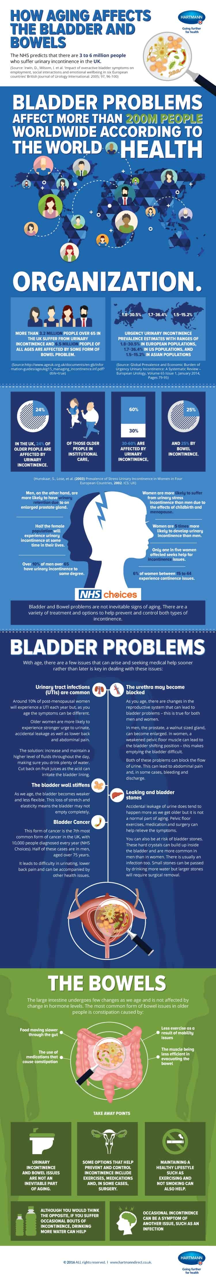 With age comes great wisdom, but with it also comes a few unpleasant effects of aging. One particularly embarrassing and common problem faced by people as they grow old is incontinence. Often, incontinence is a taboo that few people wish to discuss. This infographic by Hartmann Direct, specialists in Incontinence Products like incontinence pads and pants, shows you how common the issue actually is, so that people know that they are not suffering alone. It provides you the basic details of how many people across the world are afflicted by this problem, the common causes of incontinence, and how to prevent it as you grow older.